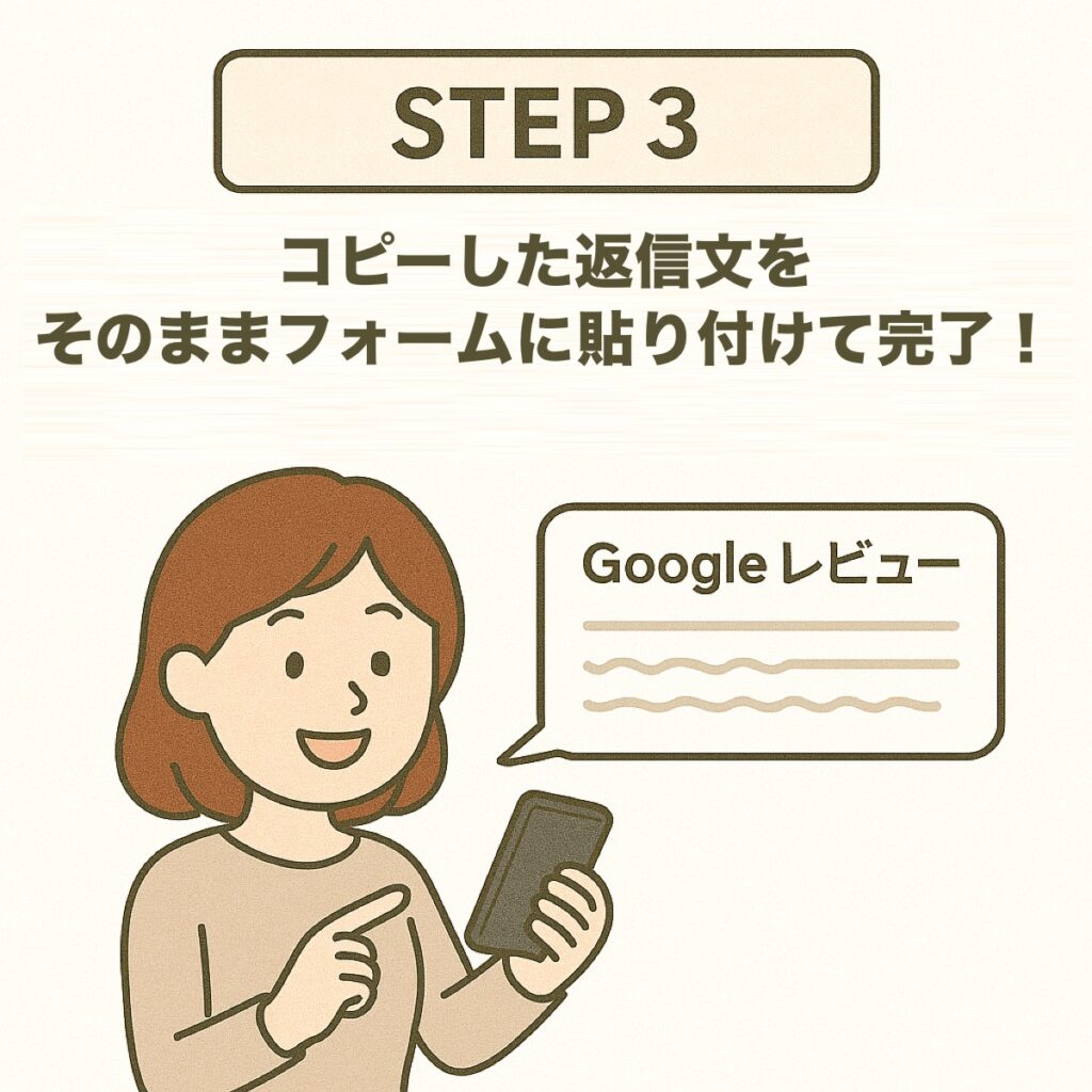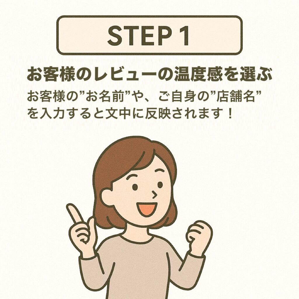 - ネイルサロン → デザインの満足度や持ちの良さ、スタッフ対応への感想に応じた返信ができます。